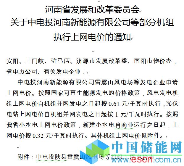 河南中電投等公司部分機(jī)組執(zhí)行上網(wǎng)電價的通知