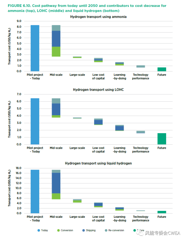 從今天到2050年的成本路徑和成本下降的因素,分別為氨(上)、LOHC(中)和液氫(下)的成本下降因素。上圖顯示了主要成本決定因素的影響。此外,由于目前還沒有整合這些技術(shù)的完整價值鏈,與未來可能實現(xiàn)的目標(biāo)相比,資本成本預(yù)計會很高。