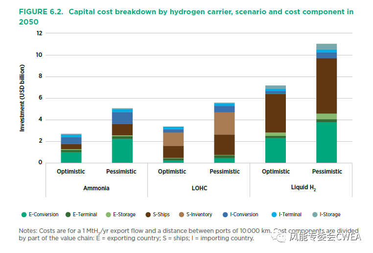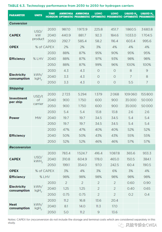 表:從2030年到2050年不同氫能載體的技術(shù)性能。如表所示,到2050年的技術(shù)性能存在很大的不確定性。在未來30年內(nèi)實現(xiàn)的具體數(shù)值將在很大程度上取決于三個方面的選擇和發(fā)展。延遲和進(jìn)展不力將增加接近悲觀條件的機(jī)會,而加速和協(xié)調(diào)的行動將允許也許甚至超過樂觀的情景。這些數(shù)值只是顯示了可追求的可能路徑以及這兩條不同路徑的后果。