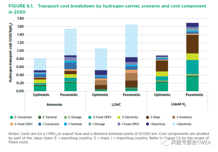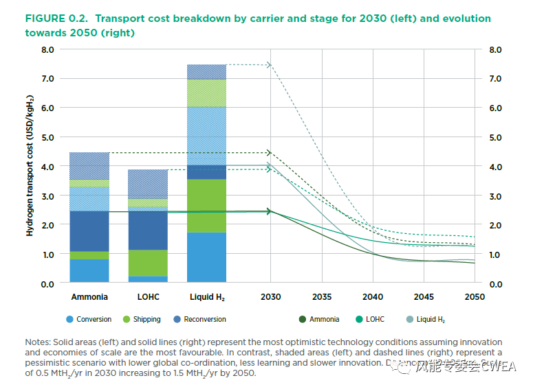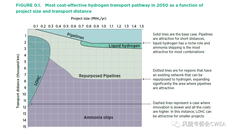 氫氣可以通過管道或船舶進(jìn)行長距離運輸。本報告比較了通過管道運輸氫氣以及通過壓縮氫氣通過船舶運輸?shù)娜N形式:氨、液態(tài)氫和液態(tài)有機(jī)氫載體 (LOHC)的區(qū)別。重點考察的氫氣的運輸,而不是使用氫制成的商品的運輸,報告提出氨既可以作為氫能載體,也可以直接用作不同應(yīng)用場景下的原料或燃料。但報告沒有包括含碳載體(如甲醇或甲烷)等。