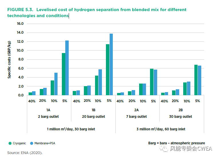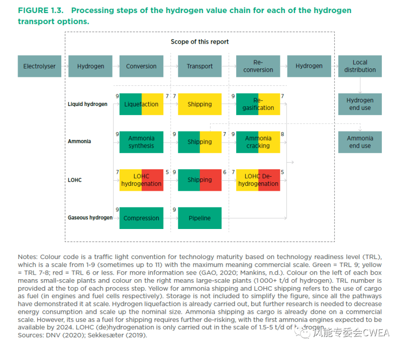 每一種氫能運輸方案的氫價值鏈所包含的處理步驟。本報告只關(guān)注從電解槽生產(chǎn)出氫氣后到本地運輸之前的范圍。