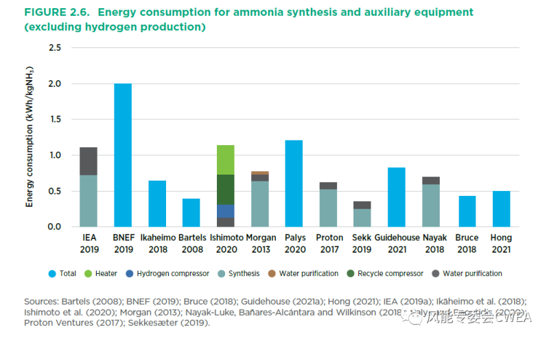 不同研究的氨合成和輔助設(shè)備的能源消耗情況(kWh/每千克氨)
