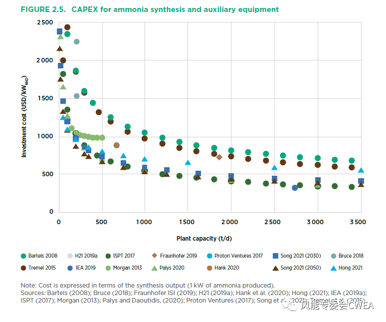 氨合成和輔助設(shè)備的資本支出(USD/每千克氨)隨工廠容量大小的變化