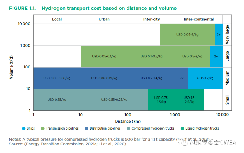 氫能運輸成本受距離和容量影響的關(guān)系較大,不同運輸方法與這兩者結(jié)合造成的成本差異很大。