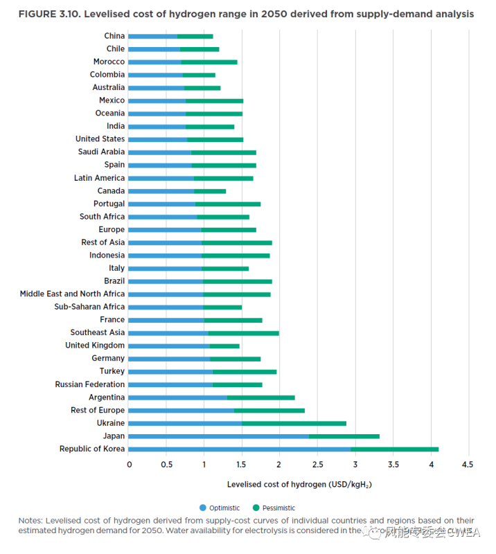 根據(jù)供需分析得出的2050年氫能平準(zhǔn)化成本的范圍(單位:USD/kgH2)