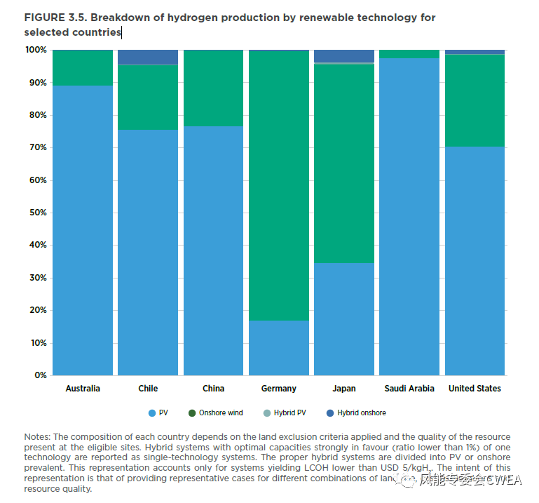 一些國家可再生能源制氫按發(fā)電技術(shù)分列的比重情況,德國將主要來自陸上風(fēng)電,但沙特將主要來自太陽能。中國、美國和智利的風(fēng)電和光伏的比例相當(dāng),太陽能被認(rèn)為更適合作為制氫的綠色電源來源。