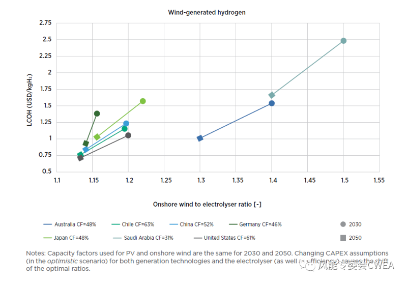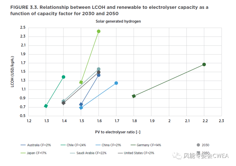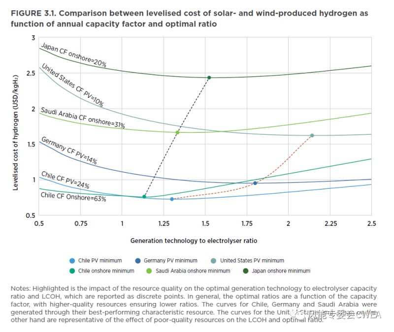 太陽能和風(fēng)能制氫的平準(zhǔn)化成本(單位:美元/kgH2)與年容量系數(shù)和最佳比率(發(fā)電技術(shù)與電解槽比率)的比較。
