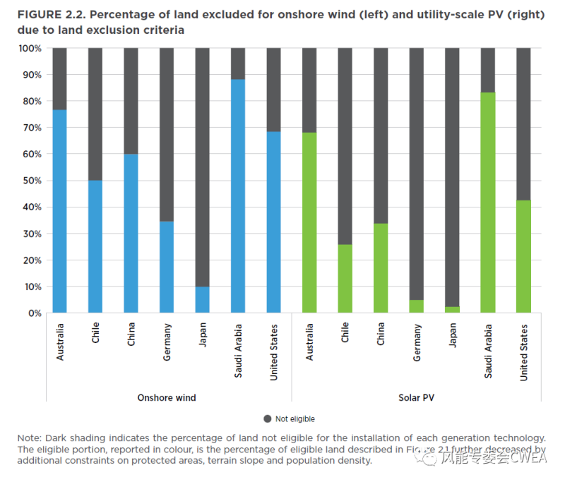 由于土地不可用標(biāo)準(zhǔn),陸上風(fēng)電(左)和公用事業(yè)級光伏(右)的土地不可用比例