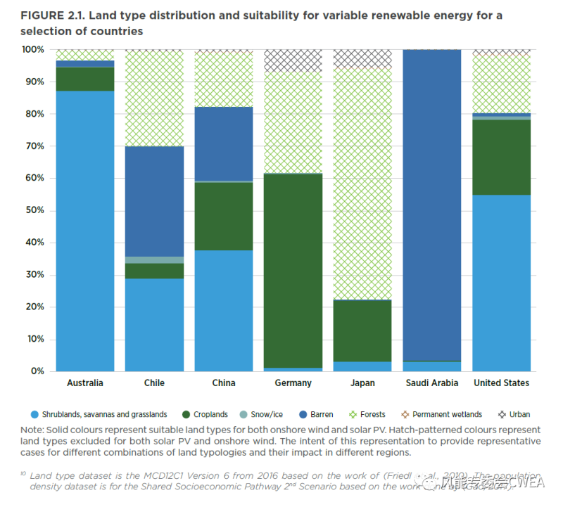 部分國家的土地類型分布及對可變可再生能源的適用性