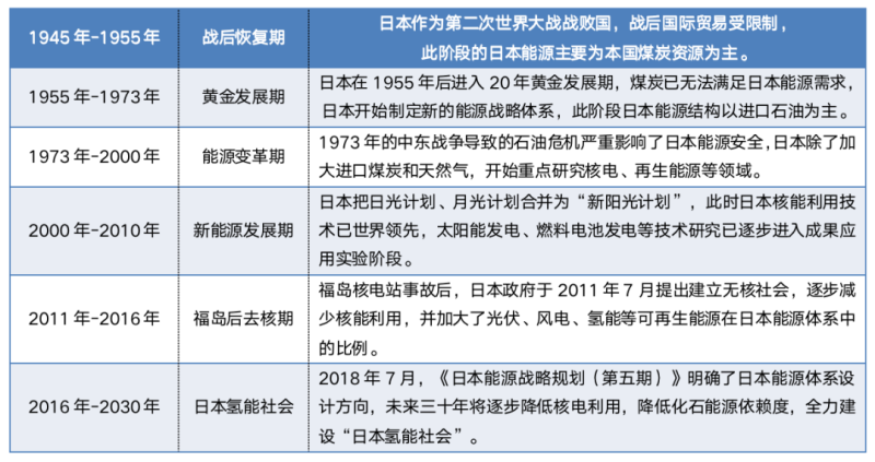氫能在日本能源戰(zhàn)略規(guī)劃中占有極其重要地位,自第二次世界大戰(zhàn)以來,日本能源體系發(fā)展自大致經(jīng)歷了六個階段,日本近十年陸續(xù)制定《日本再復(fù)興戰(zhàn)略》《氫能與燃料電池戰(zhàn)略發(fā)展路線圖》《日本能源戰(zhàn)略規(guī)劃》等一系列政策,發(fā)展氫能已提升為日本國策,日本將建設(shè)全球第一個全面利用氫能的國家。