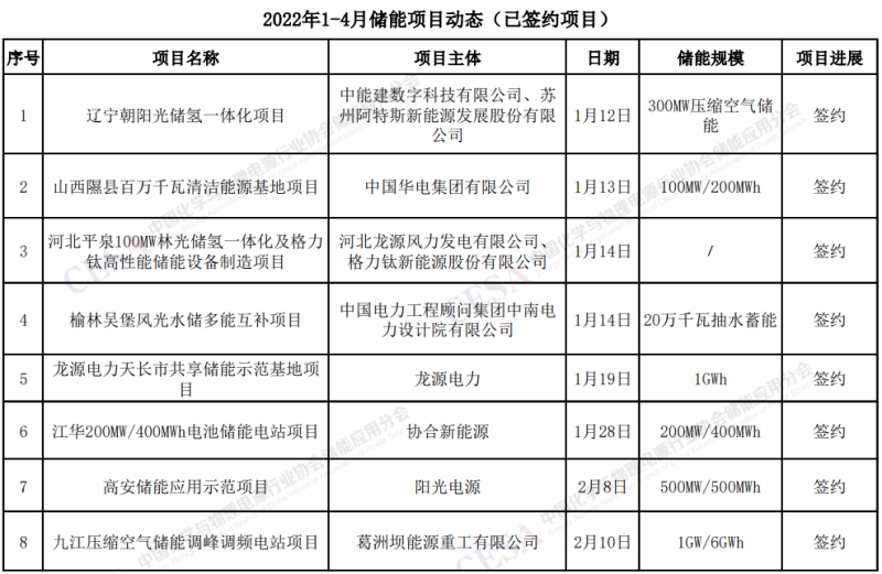 中國(guó)儲(chǔ)能網(wǎng)訊:據(jù)中國(guó)化學(xué)與物理電源行業(yè)協(xié)會(huì)儲(chǔ)能應(yīng)用分會(huì)產(chǎn)業(yè)政策研究中心不完全統(tǒng)計(jì),2022年1-4月以來(lái),主要儲(chǔ)能項(xiàng)目簽約達(dá)20個(gè),規(guī)模超10GWh。簽約項(xiàng)目類(lèi)別包括:壓縮空氣儲(chǔ)能、電化學(xué)儲(chǔ)能、抽水蓄能、氫儲(chǔ)能等。