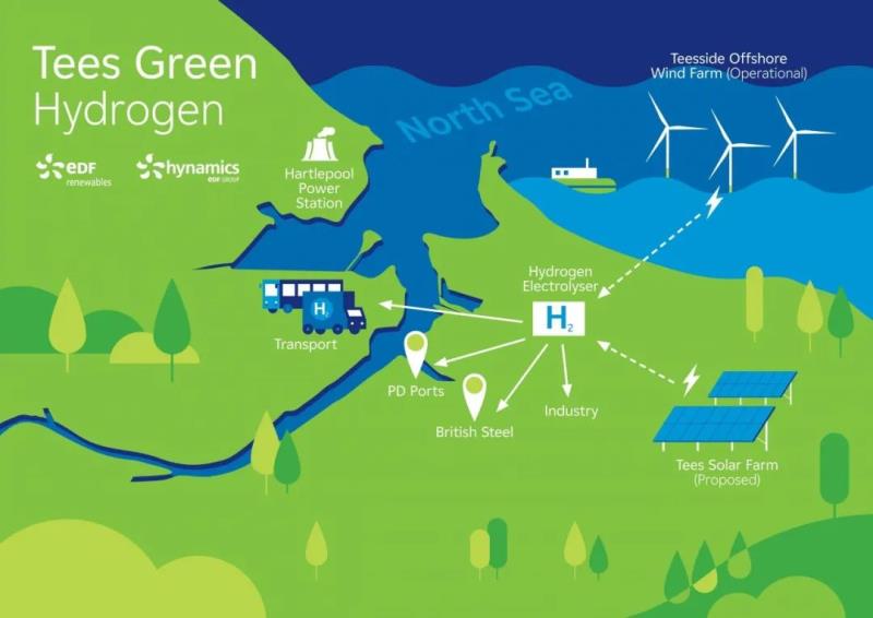 第二個(gè)是今年啟動(dòng)的英國Teesside綠氫項(xiàng)目,EDF已參與投資、建設(shè)和運(yùn)營Teesside海上風(fēng)電場,并計(jì)劃在Redcar附近建造的新光伏發(fā)電場,為其氫電解槽提供動(dòng)力,進(jìn)而提供綠氫。