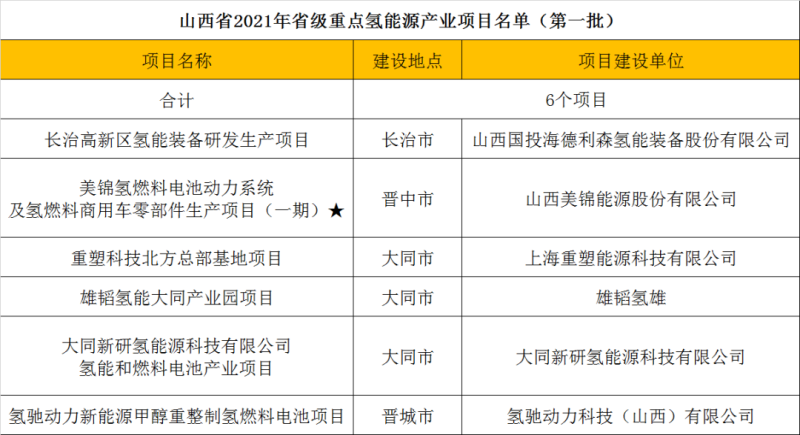 2021年5月,山西省人民政府正式發(fā)布2021年省級(jí)重點(diǎn)工程(第一批)項(xiàng)目名單,其中有6項(xiàng)涉及氫能,加速推進(jìn)氫能裝備及燃料電池制造進(jìn)程,從而“以點(diǎn)帶面”推動(dòng)山西氫能源產(chǎn)業(yè)長(zhǎng)足發(fā)展。