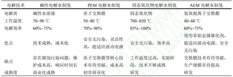 由可再生能源電解水制氫,能有效解決可再生能源消納問題,而如何提升電解水制氫的效率,降低技術成本,是突破該項技術發(fā)展的關鍵。目前電解水制氫主要分為堿性電解水制氫、質子交換膜(PEM)電解水制氫、固態(tài)氧化物電解水制氫和陰離子交換膜(AEM)電解水制氫四種技術路線,其情況對比如表1所示。其中堿性電解水制氫技術成熟度最高,成本最低,但存在腐蝕問題,且啟停響應時間較長,不適合波動性電源。質子交換膜電解水制氫目前已實現(xiàn)初步商業(yè)化,其響應速度快,能適應波動性電源,但成本較高,且中國在質子交換膜等核心技術上有待進一步突破。固態(tài)氧化物電解水制氫效率高,工作溫度高,目前處于小規(guī)模示范階段。陰離子交換膜電解水制氫結合了堿性電解水制氫和質子交換膜電解水制氫的優(yōu)點,成本較低,且能很好地適應波動性電源。該技術目前尚處于研發(fā)階段,生產規(guī)模受到限制。