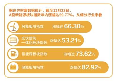 據(jù)東方財(cái)富數(shù)據(jù)統(tǒng)計(jì),截至12月24日,A股新能源板塊指數(shù)年內(nèi)漲幅達(dá)54.27%,從細(xì)分行業(yè)來看,風(fēng)能板塊指數(shù)漲幅達(dá)62.66%,光伏建筑一體化板塊指數(shù)年內(nèi)漲幅達(dá)47.74%,氫能源板塊指數(shù)年內(nèi)漲幅達(dá)68.06%,儲(chǔ)能板塊指數(shù)漲幅達(dá)77.02%。