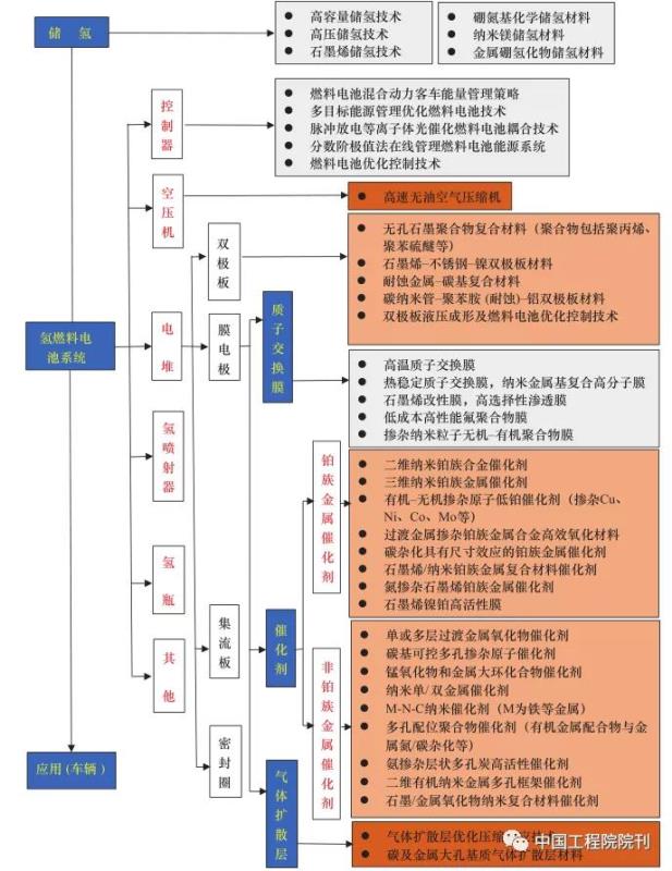 氫燃料電池與常見的鋰電池不同,系統(tǒng)更為復雜,主要由電堆和系統(tǒng)部件(空壓機、增濕器、氫循環(huán)泵、氫瓶)組成。電堆是整個電池系統(tǒng)的核心,包括由膜電極、雙極板構成的各電池單元以及集流板、端板、密封圈等。膜電極的關鍵材料是質子交換膜、催化劑、氣體擴散層,這些部件及材料的耐久性(與其他性能)決定了電堆的使用壽命和工況適應性。近年來,氫燃料電池技術研究集中在電堆、雙極板、控制技術等方面,氫燃料電池技術體系及部分相關前沿研究如圖 1 所示。