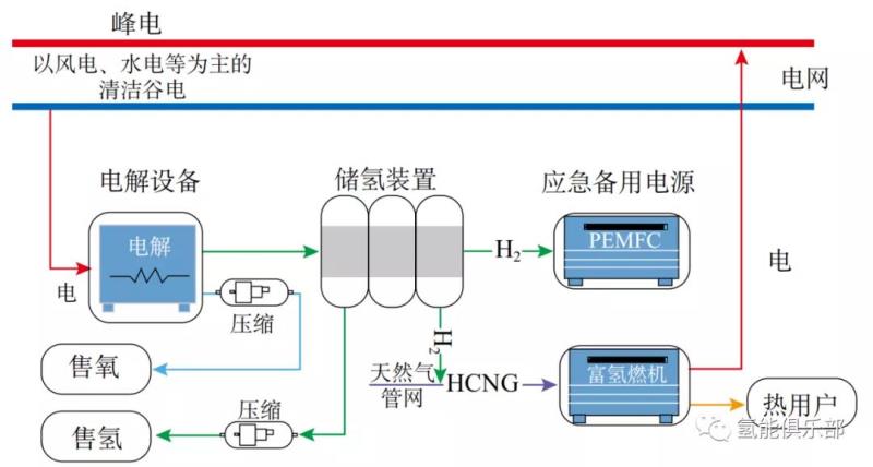 氫儲能是支撐高比例可再生能源發(fā)展有效方式之一。傳統(tǒng)電 -氫 -電的儲能方式綜合效率低、造價高,現(xiàn)階段不具備經濟適用性。借助我國跨區(qū)域特高壓輸電通道優(yōu)勢,將可再生資源豐富地區(qū)的電能輸送到高純氫負荷中心,建設氫儲能調峰站,谷電時段制氫儲能(P2H),峰電時段天然氣摻氫富氫燃機發(fā)電回饋電網,可以實現(xiàn)可再生能源消納,提高輸電通道利用率,緩解東部城市峰谷電差大的問題,解決氫氣遠距離運輸成本、安全等難題。