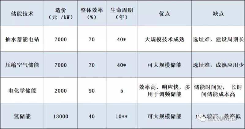 氫儲能目前存在的問題是效率較低、造價高。電解水制氫效率達 65%~75%,燃料電池發(fā)電效率為 50%~60%,單過程轉換效率相對較高,但電 - 氫 -電過程存在兩次能量轉換,整體效率較低。制氫設備的單位造價約 2000 元 /kW,儲氫和輔助系統(tǒng)造價為 2000 元 /kW,燃料電池發(fā)電系統(tǒng)造價約9000 元 /kW,燃料電池的投資占到氫儲能系統(tǒng)總投資的接近 70%;且現(xiàn)階段規(guī)模化燃料電池發(fā)電系統(tǒng)應用較少,技術成熟度、系統(tǒng)壽命有待驗證。