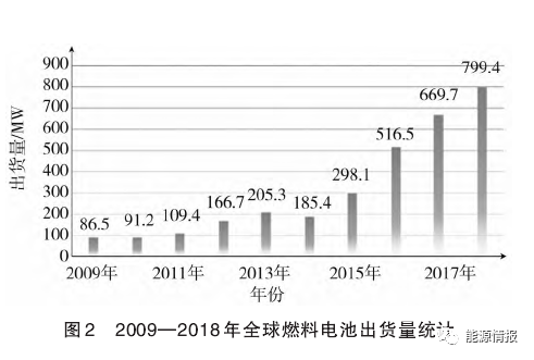 燃料電池通過電化學(xué)反應(yīng)將氫氣的化學(xué)能直接轉(zhuǎn)化為電能,清潔無污染,能量轉(zhuǎn)化效率高,是氫能源的最佳利用方式,在全球范圍內(nèi)具有廣闊的應(yīng)用前景。2009—2018 年全球燃料電池出貨量統(tǒng)計(jì)如圖 2 所示,由圖可見出貨量統(tǒng)計(jì)數(shù)據(jù)增勢(shì)明顯。燃料電池類型主要包括堿性電解質(zhì)、質(zhì)子交換膜、磷酸、熔融碳酸鹽和固體氧化物燃料電池,區(qū)別在于電解質(zhì)和工作環(huán)境溫度不同,適合的應(yīng)用場(chǎng)景也有差異。