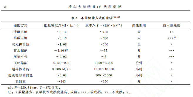 3)電磁儲(chǔ)能,包括超導(dǎo)體儲(chǔ)能和超級(jí)電容 器儲(chǔ)能.氫儲(chǔ)能的基本原理是電解水產(chǎn)生氫氣和氧氣,可以將其看作是化學(xué)儲(chǔ)能的延伸。表3歸納了不同儲(chǔ)能方式的能量密度、成 本、儲(chǔ)能期限和技術(shù)成熟度。對(duì)比可知,氫儲(chǔ)能相比于其他儲(chǔ)能方式有諸多優(yōu)點(diǎn).氫儲(chǔ)能的能量 密度顯著高于其他儲(chǔ)能方式,儲(chǔ)能期限較長(zhǎng),滿 足長(zhǎng)時(shí)間儲(chǔ)能的需求,可實(shí)現(xiàn)可再生能源的跨季 儲(chǔ)能和跨區(qū)域能量傳遞.此外,電解水制氫可以提高可再生能源利用率,減少化石燃料的使用, 提高能源體系清潔化。氫儲(chǔ)能成本低于電化學(xué)儲(chǔ)能、電磁儲(chǔ)能和飛輪儲(chǔ)能,盡管略高于發(fā)展時(shí)間較久的壓縮空氣儲(chǔ)能和蓄水儲(chǔ)能,但隨著氫氣制備和儲(chǔ)運(yùn)技術(shù)的進(jìn)一步發(fā)展,市場(chǎng)規(guī)模的進(jìn)一步擴(kuò)大,成本將會(huì)進(jìn)一步降低.氫儲(chǔ)能是前景廣闊的可再生能源儲(chǔ)能方式,可在能源互聯(lián)網(wǎng)的構(gòu)建方面發(fā)揮重要作用。