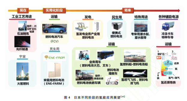 如圖4所示,日本對(duì)不同階段氫能在不同領(lǐng) 域的應(yīng)用進(jìn)行了分析,顯示了氫能在當(dāng)下能源系 統(tǒng)中的重要位置以及未來(lái)能源互聯(lián)網(wǎng)系統(tǒng)中的具體應(yīng)用前景.目前,日本比較成熟的氫能應(yīng)用包括石油精煉、光纖制造等工業(yè)制造領(lǐng)域和被當(dāng)作高能燃料使用的航空航天領(lǐng)域;目前處于實(shí)用化階段的應(yīng)用主要包括燃料電池汽車和家用燃料電池電站;隨著氫能相關(guān)技術(shù)的不斷進(jìn)步, 未來(lái)還會(huì)進(jìn)一步被用于業(yè)務(wù)產(chǎn)業(yè)用燃料電池發(fā)電、家用或特殊用途的燃料電池、不同類型的燃料電池交通工具(包括業(yè)務(wù)用車、公共汽車、列車、船、飛機(jī))等 各種備用電源,以及更多的工業(yè)應(yīng)用等。