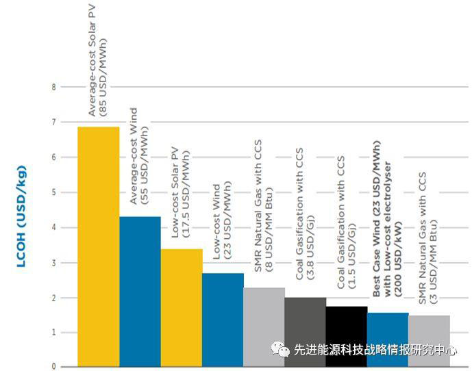圖2 各種制氫技術(shù)成本現(xiàn)狀(單位:美元/kg)