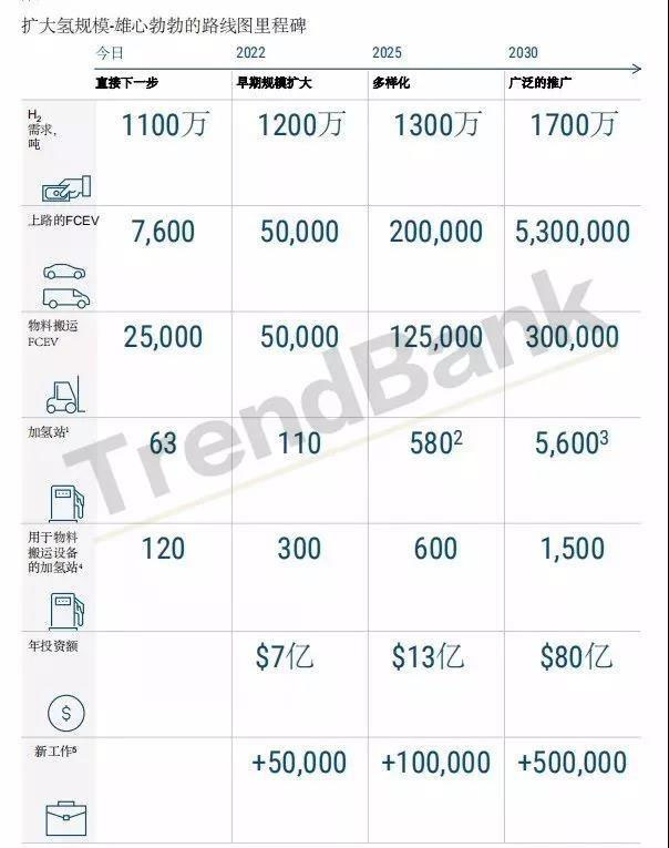 到2030年,氫需求量將突破1700萬(wàn)噸,在美國(guó)道路上有530萬(wàn)輛FCEV,在物料搬運(yùn)中有300000輛FCEV搬運(yùn)工具,在全美范圍內(nèi)有5600個(gè)加氫站。