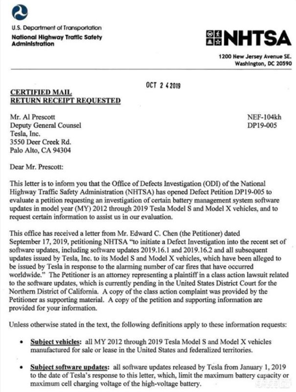NHTSA的缺陷調(diào)查辦公室在收到了這封請(qǐng)?jiān)笗?,?0月1日開始著手調(diào)查特斯拉汽車在全球范圍內(nèi)發(fā)生的自燃事件。