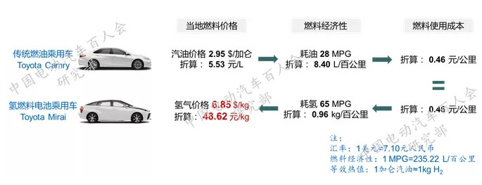 在美國加州,氫氣售價(jià)需要在50元/kg以下才能與汽油形成同等競爭力4。加州當(dāng)?shù)仄褪蹆r(jià)折合5.53元/升,傳統(tǒng)燃油乘用車的油耗水平約8.4升/百公里,則燃料使用成本折合約0.46元/公里。對(duì)比同一級(jí)別的氫燃料電池乘用車,車輛氫耗水平約為0.93kg/百公里,可推出結(jié)論,當(dāng)氫氣終端銷售價(jià)格降至50元/kg時(shí),才能使氫燃料電池乘用車的能源使用成本與傳統(tǒng)燃油車型達(dá)到同等水平。