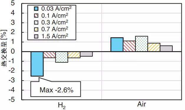 下圖為不同電流密度工況下氫氣(空氣)與冷卻液的熱交換量比值。結(jié)果表明,氫氣和空氣的熱交換量與冷卻液熱交換量比值最大在3%左右。兩種氣體和冷卻液熱交換量比值大小取決于電堆電流密度(因?yàn)闅怏w和冷卻液的進(jìn)口溫度和流速均不等)。注意,電堆端側(cè)氫氣熱交換量負(fù)值是因?yàn)殡姸呀Y(jié)構(gòu)導(dǎo)致,即氫氣流動(dòng)方向和冷卻液相反。