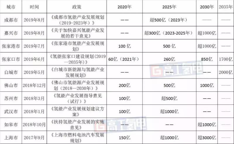 據(jù)高工氫電統(tǒng)計(jì),截至目前,全國已經(jīng)有佛山、深圳、茂名、成都、北京、株洲等24個(gè)城市發(fā)布相關(guān)的氫能規(guī)劃路線圖。其中,成都市、上海市、如皋市、嘉興市、蘇州市、武漢市、張家口市、佛山市、白城市、張家港市等10大城市在規(guī)劃中明確了到2020年、2025年、2030、2035年氫能產(chǎn)業(yè)年產(chǎn)值目標(biāo),詳見下表: