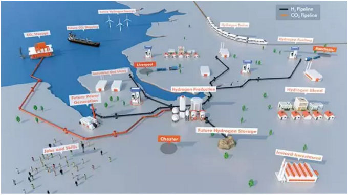 Hydeploy項(xiàng)目示意圖:黑色管線為氫氣運(yùn)輸管道,中間交匯處為制氫廠,橙色管線用于制氫過程中的二氧化碳捕捉