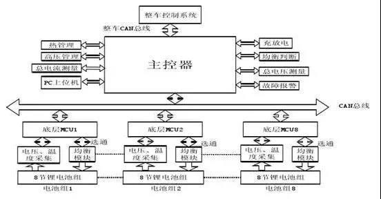 動力電池管理系統(tǒng),只有一層集中式或者兩分布式,基本不會出現(xiàn)三層的情況。小型車主要應(yīng)用一層集中式電池管理系統(tǒng)。兩層的分布式動力電池管理系統(tǒng),如下圖所示。