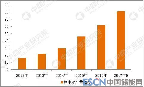 2012-2017年中國鋰電池產(chǎn)量統(tǒng)計