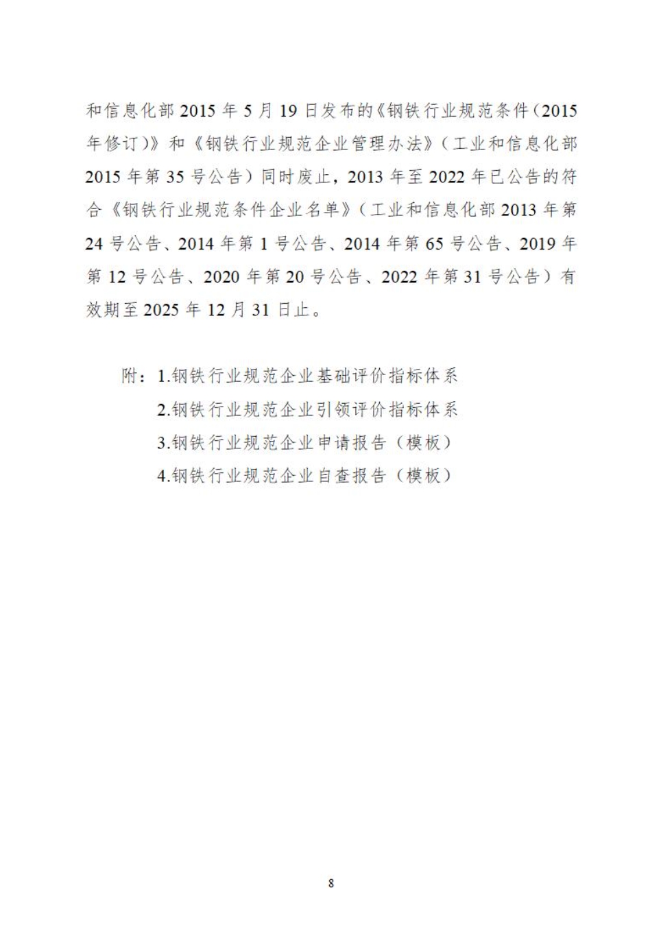 為加快推動鋼鐵行業(yè)轉(zhuǎn)型升級,促進(jìn)行業(yè)高質(zhì)量發(fā)展,我部對《鋼鐵行業(yè)規(guī)范條件(2015年修訂)》進(jìn)行了修訂,形成《鋼鐵行業(yè)規(guī)范條件(2025年版)》,現(xiàn)予以公告。《鋼鐵行業(yè)規(guī)范條件(2015年修訂)》和《鋼鐵行業(yè)規(guī)范企業(yè)管理辦法》(工業(yè)和信息化部2015年第35號公告)同時廢止。