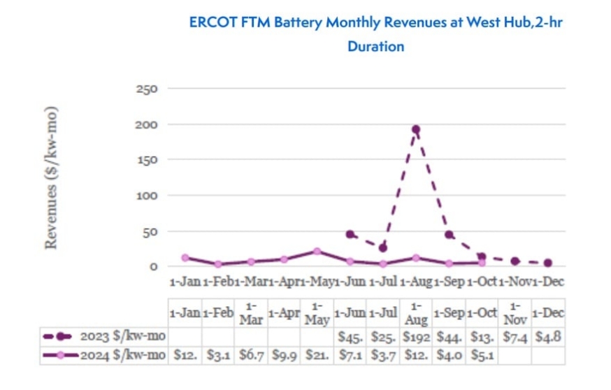 研究發(fā)現(xiàn),在2024年電力需求較高的月份,ERCOT市場運營的電池儲能系統(tǒng)收入大幅下降,僅為2023年的5%~10%。響應性儲備服務(RRS)價格從2023年的120美元/MWh暴跌至2024年的8美元/MWh,降幅高達15倍。