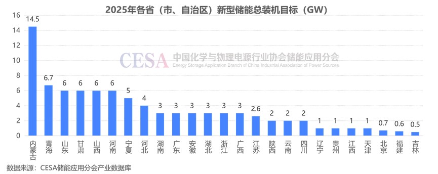 據(jù)CESA儲能應(yīng)用分會產(chǎn)業(yè)數(shù)據(jù)庫不完全統(tǒng)計的全國25個?。ㄊ?、自治區(qū))2025年的新型儲能裝機目標(biāo)中山東、甘肅、山西、河南總裝機目標(biāo)均為6GW,并列全國第三。