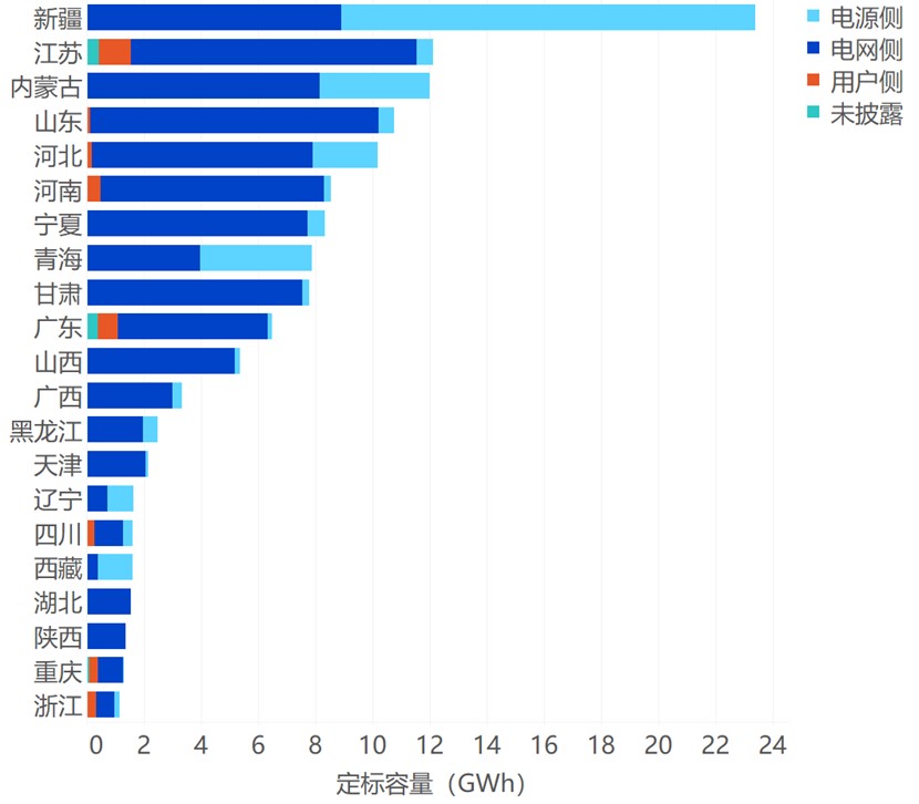2024年,10個(gè)省市自治區(qū)定標(biāo)規(guī)模超過(guò)6GWh,新疆、江蘇、內(nèi)蒙古、山東、河北位居前五,中標(biāo)(候選人)公示規(guī)模均超10GWh,前五總落地規(guī)模約占全國(guó)的一半。