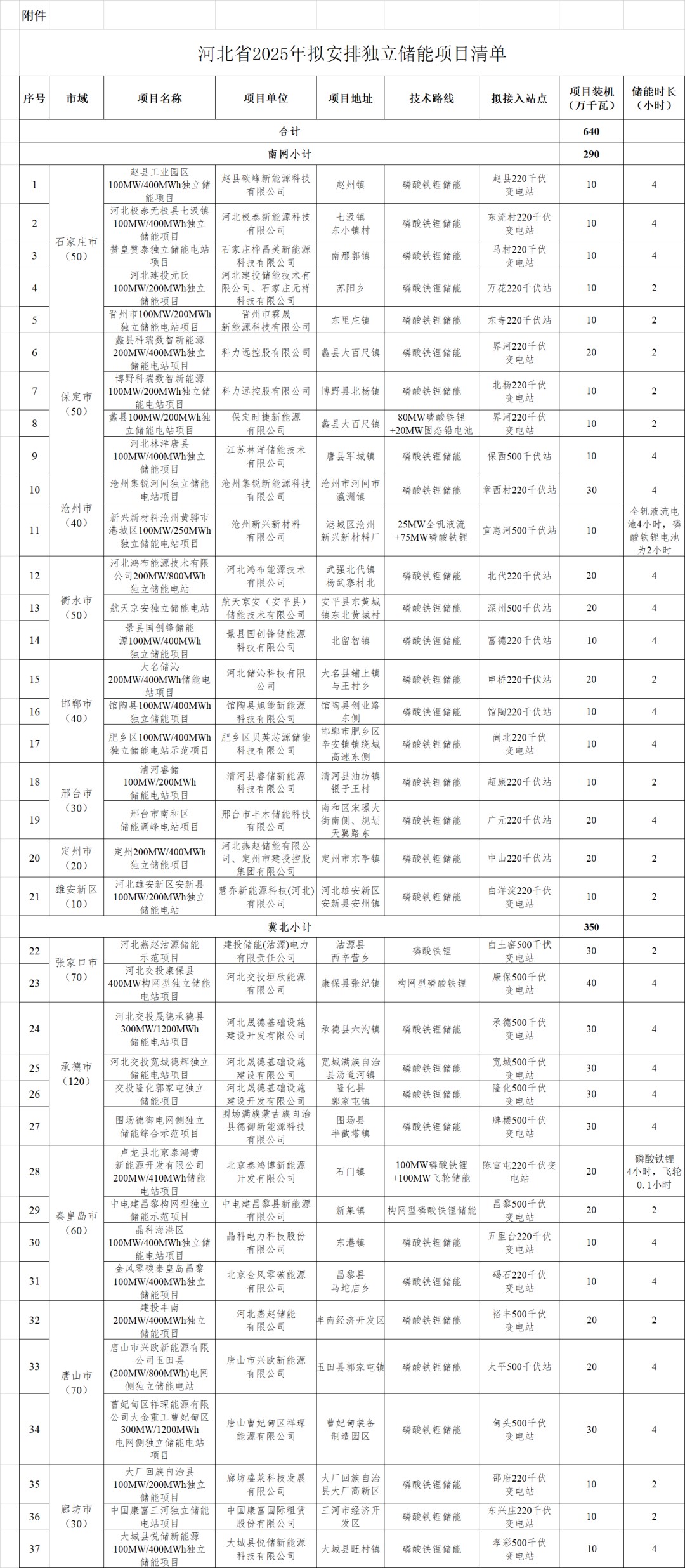 2月12日,河北省發(fā)改委發(fā)布《河北省2025年擬安排獨(dú)立儲(chǔ)能項(xiàng)目情況公示》,共公示獨(dú)立儲(chǔ)能項(xiàng)目37個(gè)、裝機(jī)容量6.4GW/20.86GWh。