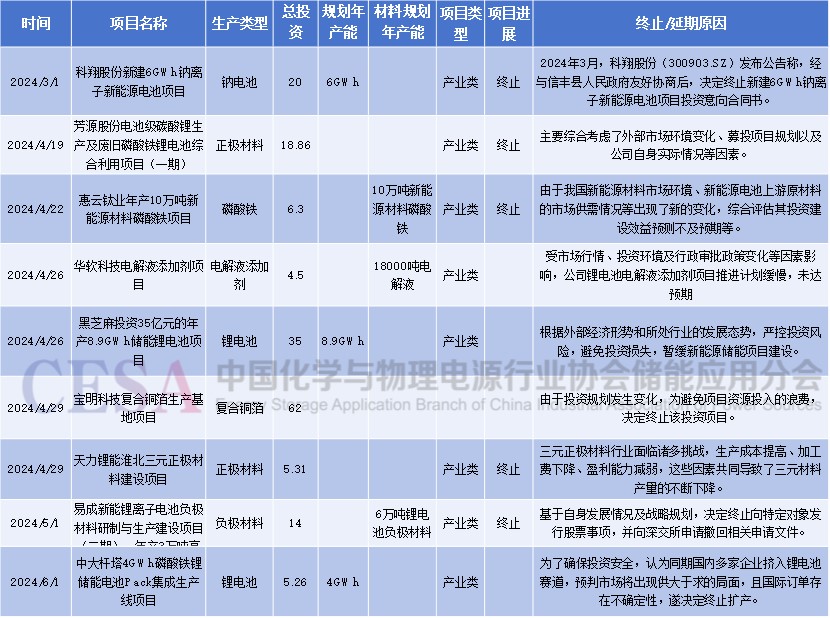 據CESA儲能應用分會產業(yè)數據庫不完全統(tǒng)計,自2024年3月至2025年1月共有19個與儲能相關的建設項目終止或者延期,投資合計278.29億元。其中產業(yè)類項目14個,數量占比73.68%。