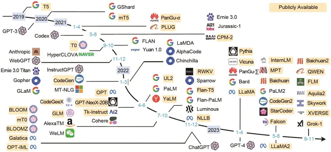圖1 模型參數(shù)大于10B的大語(yǔ)言模型公開(kāi)報(bào)道時(shí)間線