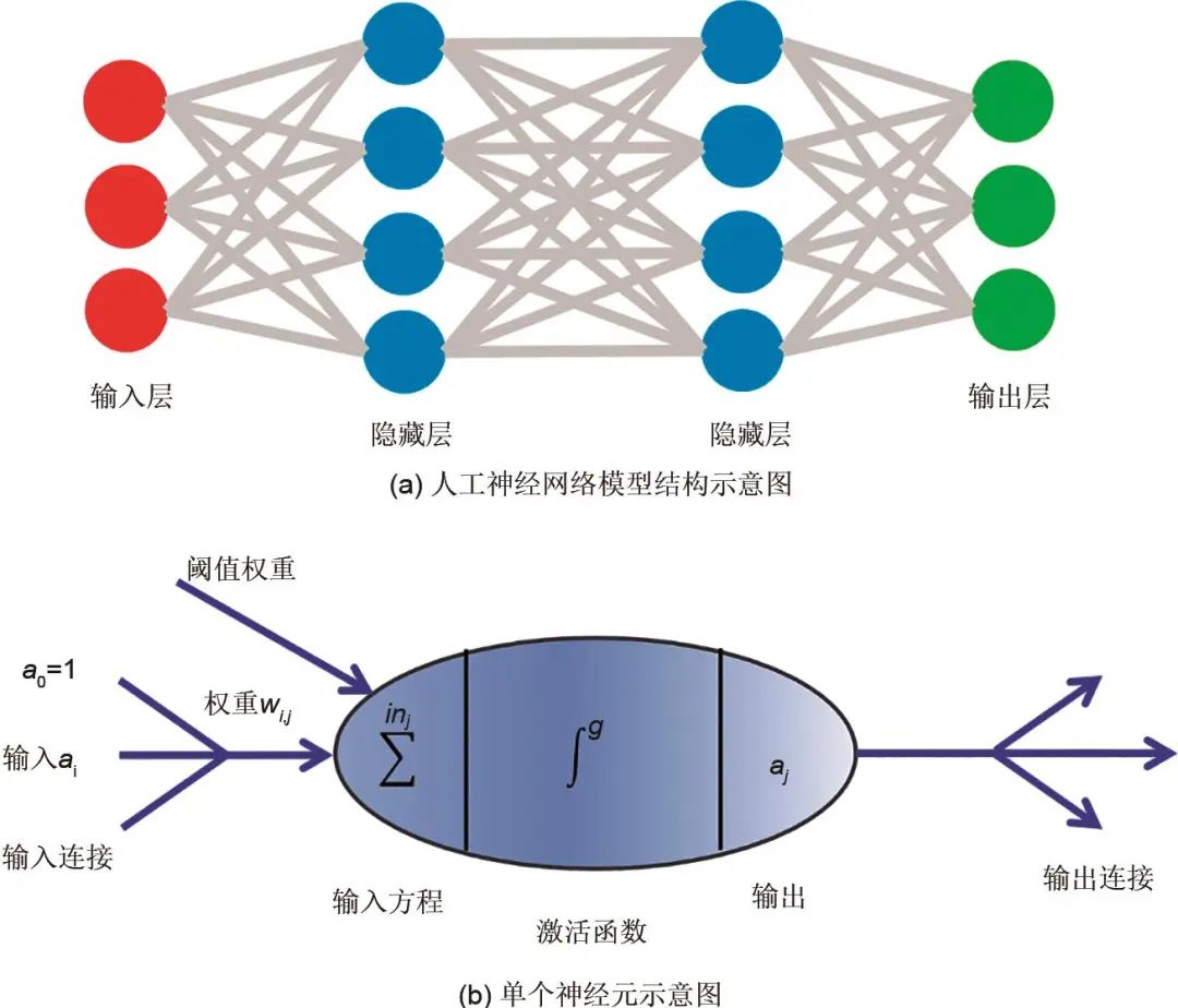 大語(yǔ)言模型的基本結(jié)構(gòu)為人工神經(jīng)網(wǎng)絡(luò)(圖2)。人工神經(jīng)網(wǎng)絡(luò)借鑒了神經(jīng)元間相互聯(lián)系的生理構(gòu)造和傳遞信息的生理功能,可以用于回歸、分類(lèi)等任務(wù)。最簡(jiǎn)單的神經(jīng)網(wǎng)絡(luò)由輸入層、隱藏層和輸出層組成,每一層由多個(gè)神經(jīng)元組成。對(duì)于單個(gè)神經(jīng)元,在接收上一層神經(jīng)元的數(shù)據(jù)并經(jīng)過(guò)計(jì)算處理后,將數(shù)據(jù)傳遞給下一層神經(jīng)元。人工神經(jīng)網(wǎng)絡(luò)能擬合高度非線性的場(chǎng)景,且適用于處理復(fù)雜多變的自然語(yǔ)言。