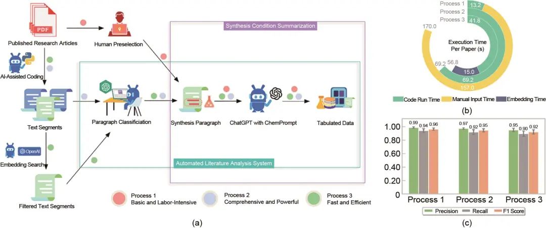 圖4 ChatGPT化學(xué)助手三種工作流程示意圖。(a) ChatGPT化學(xué)助手工作流程圖,三種工作流程分別用紅點(diǎn)、藍(lán)點(diǎn)和綠點(diǎn)標(biāo)識(shí);(b) 每種流程閱讀和處理一篇文獻(xiàn)的平均用時(shí)比較;(c) 每種流程的總平均精度、召回率和F1分?jǐn)?shù),圖表中的灰色誤差棒表示標(biāo)準(zhǔn)差