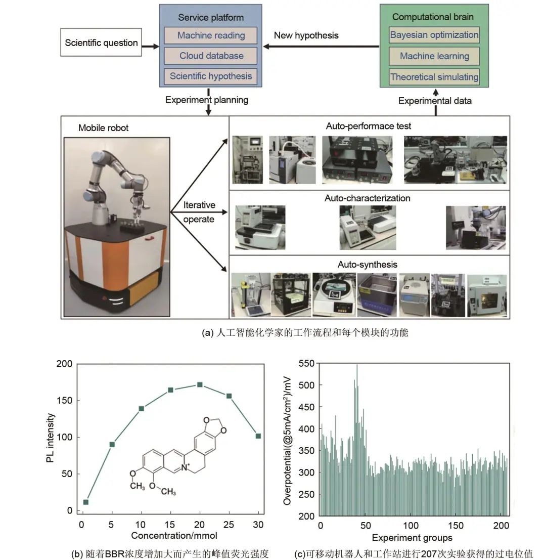 一種自然的改進(jìn)想法是通過(guò)大語(yǔ)言模型的信息處理功能來(lái)學(xué)習(xí)已有的文獻(xiàn)數(shù)據(jù),將已有的物理、化學(xué)知識(shí)嵌入智能機(jī)器人。2022年,中國(guó)科學(xué)技術(shù)大學(xué)江俊教授團(tuán)隊(duì)研發(fā)出由服務(wù)平臺(tái)、可移動(dòng)機(jī)器人、工作站和計(jì)算大腦組成的“機(jī)器化學(xué)家”(圖6),它能夠閱讀文獻(xiàn)、提出假設(shè)、執(zhí)行自動(dòng)化操作、分析實(shí)驗(yàn)數(shù)據(jù)、訓(xùn)練機(jī)器學(xué)習(xí)模型并反饋產(chǎn)生新的假設(shè)。實(shí)際性能方面,“全流程人工智能化學(xué)家”閱讀了15979篇論文,從文獻(xiàn)的4865個(gè)分子中篩選出發(fā)射波長(zhǎng)位于可見(jiàn)光波段的具有聚集誘導(dǎo)發(fā)射特性的生物相容性發(fā)光體,并確定了發(fā)光體的最佳濃度為20 mmol左右[圖6(b)]。在另一個(gè)實(shí)驗(yàn)中,機(jī)器化學(xué)家通過(guò)篩選將實(shí)驗(yàn)次數(shù)降低到207次,大大提高了基于MIL-101 MOF的高熵電催化劑的設(shè)計(jì)與合成效率,并且最終從中選取出相同電流密度下過(guò)電勢(shì)最低的電催化劑。具體而言,隨著實(shí)驗(yàn)的開(kāi)展與模型的迭代,207次實(shí)驗(yàn)中不同電催化劑在5 mA/cm2的電流密度下的過(guò)電勢(shì)總體呈下降趨勢(shì)[圖6(c)]。這一結(jié)果體現(xiàn)了機(jī)器化學(xué)家在自主篩選發(fā)現(xiàn)新催化劑材料方面的可行性與巨大潛力。