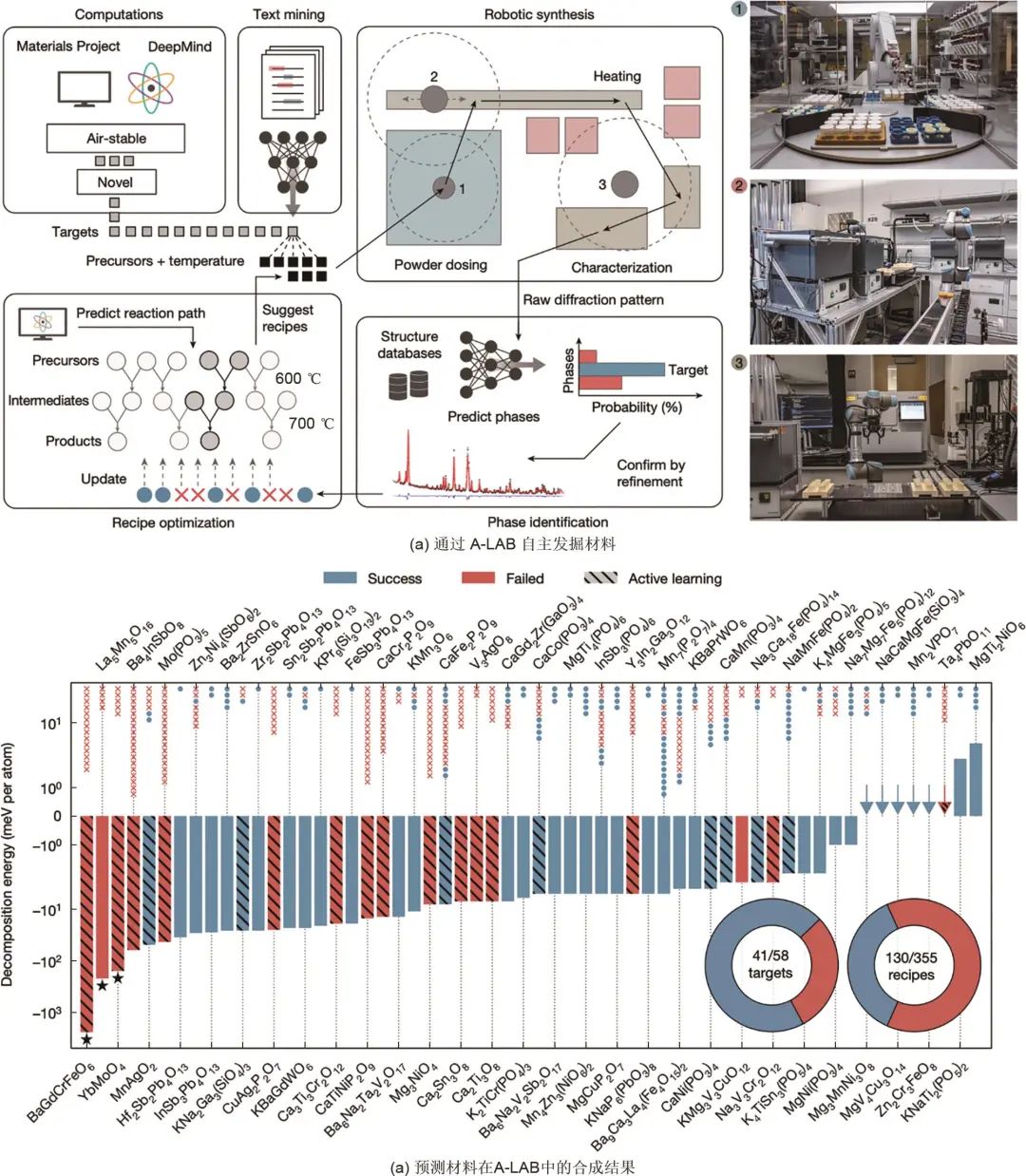 最新的智能機(jī)器人將數(shù)據(jù)庫(kù)篩選與檢索、文本挖掘、機(jī)器學(xué)習(xí)、主動(dòng)學(xué)習(xí)和機(jī)器人技術(shù)相結(jié)合,建立從數(shù)據(jù)獲取到產(chǎn)品迭代一體化的自主人工智能實(shí)驗(yàn)室,以高成功率合成了滿(mǎn)足要求的新型材料,證明了人工智能驅(qū)動(dòng)平臺(tái)在自主發(fā)現(xiàn)新材料方面的有效性,并推動(dòng)了文獻(xiàn)知識(shí)、計(jì)算化學(xué)和機(jī)器人技術(shù)的進(jìn)一步協(xié)同發(fā)展。2023年,美國(guó)加州大學(xué)伯克利分校的Gerbrand Ceder教授團(tuán)隊(duì)開(kāi)發(fā)了用于無(wú)機(jī)粉末固態(tài)合成的自主實(shí)驗(yàn)室A-Lab平臺(tái)[圖7(a)]。首先,該平臺(tái)使用數(shù)據(jù)庫(kù)篩選與文本挖掘策略獲得項(xiàng)目所需數(shù)據(jù)集,在Materials Project數(shù)據(jù)庫(kù)中交叉篩選理論可行但是實(shí)驗(yàn)中未報(bào)道的數(shù)據(jù),并在24304篇出版物中提取到33343個(gè)固態(tài)樣品合成方案。然后,該平臺(tái)應(yīng)用兩套機(jī)器學(xué)習(xí)模型分別提供五個(gè)初始合成配方以及合成溫度,通過(guò)調(diào)用三個(gè)基于機(jī)器人技術(shù)的集成工作站進(jìn)行實(shí)驗(yàn),分別用于樣品制備、加熱和表征。最后,平臺(tái)自動(dòng)檢驗(yàn)產(chǎn)品質(zhì)量,若該輪實(shí)驗(yàn)合成產(chǎn)物未能達(dá)到所需目標(biāo)50%以上的產(chǎn)率,平臺(tái)將繼續(xù)使用基于主動(dòng)學(xué)習(xí)的自主反應(yīng)路線優(yōu)化模塊進(jìn)行迭代實(shí)驗(yàn),并對(duì)失敗的合成分析提供直接且可行的建議,以改進(jìn)當(dāng)前的材料篩選和合成設(shè)計(jì)方案。該平臺(tái)通過(guò)上述工作流程,在17?天的連續(xù)運(yùn)作中合成了58種目標(biāo)化合物中的41種,成功率為71%[圖7(b)]。