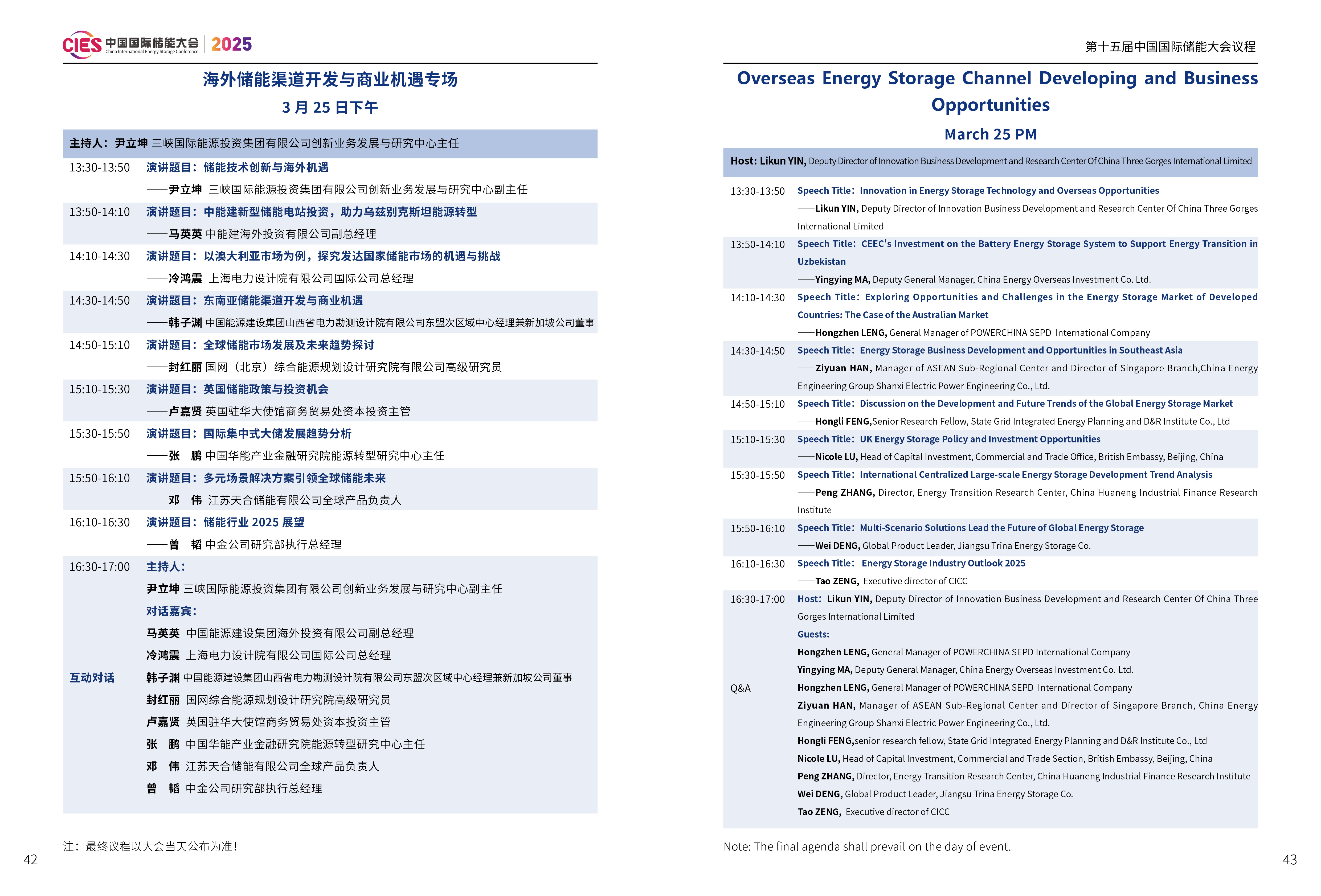 CIES2025儲(chǔ)能大會(huì)將設(shè)置:大會(huì)開幕式暨特邀院士專家報(bào)告、數(shù)智化配電網(wǎng)與新型儲(chǔ)能融合創(chuàng)新、新型電力系統(tǒng)與并網(wǎng)調(diào)度、新型儲(chǔ)能與新能源大基地協(xié)同發(fā)展、國(guó)際儲(chǔ)能、電力輔助服務(wù)、現(xiàn)貨交易及容量市場(chǎng)、工業(yè)綠色微電網(wǎng)、國(guó)家儲(chǔ)能標(biāo)準(zhǔn)宣貫、數(shù)智化新型儲(chǔ)能系統(tǒng)集成解決方案(上、下)、儲(chǔ)能消防、安全與檢測(cè)認(rèn)證、新型儲(chǔ)能資本與投資、液流電池、儲(chǔ)熱與長(zhǎng)時(shí)儲(chǔ)能、混合儲(chǔ)能、2025 新型儲(chǔ)能系列研究報(bào)告暨行業(yè)百?gòu)?qiáng)發(fā)布、數(shù)智化工商業(yè)儲(chǔ)能解決方案與商業(yè)案例、虛擬電廠與車網(wǎng)互動(dòng)、海外儲(chǔ)能渠道開發(fā)與商業(yè)機(jī)遇、構(gòu)網(wǎng)型儲(chǔ)能系統(tǒng)及項(xiàng)目建設(shè)、儲(chǔ)能專用電池與ESG、新品發(fā)布會(huì)等23個(gè)專場(chǎng),以下為海外儲(chǔ)能渠道開發(fā)與商業(yè)機(jī)遇專場(chǎng)議程(最終議程以大會(huì)當(dāng)天發(fā)布為準(zhǔn))。