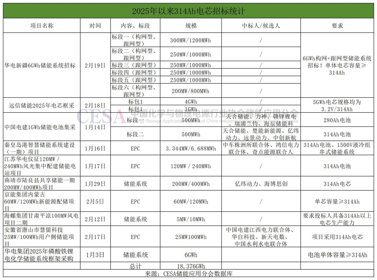 進入2025年,314Ah電芯全面替代280Ah電芯的趨勢明顯加快,據CESA儲能應用分會數據庫不完全統(tǒng)計,今年以來,招投標市場中明確314Ah儲能電芯需求的項目共有10個,容量規(guī)模18.4GWh,接近于去年前9個月招標總量。