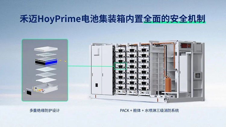 更重要的是,禾邁儲能系統(tǒng)采用主動安全技術(shù),為儲能電站安全運行筑起堅實堡壘。其中,HoyPrime電池集裝箱采用多重絕緣防護(hù)措施,確保電池系統(tǒng)的絕緣安全性;設(shè)置電芯+PACK+電池簇+匯流柜四級短路保護(hù),減少電芯短路風(fēng)險;配備PACK+艙體+水噴淋三級消防系統(tǒng),可在熱失控發(fā)生時迅速抑制火勢蔓延。