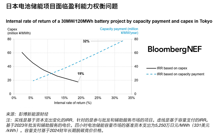 對(duì)于容量競(jìng)價(jià)中無(wú)補(bǔ)貼的四小時(shí)電池儲(chǔ)能系統(tǒng),假設(shè)它們以競(jìng)價(jià)價(jià)格上限清算,東京和北海道地區(qū)的無(wú)杠桿內(nèi)部收益率(IRR)可能分別為32%和24%。如果項(xiàng)目以價(jià)格上限的一半簽約,東京地區(qū)的IRR將降至16%。
