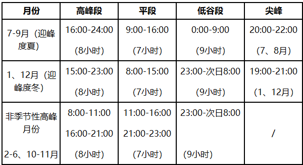 電價浮動比例:低谷段電價在用戶購電價格加輸配電價基礎上下浮61.8%;季節(jié)性(1月、7—9月、12月)高峰電價上浮84.3%,其他月份高峰電價上浮74%。尖峰電價在高峰電價基礎上上浮20%。